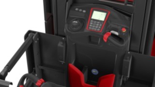 Die Mastkonstruktion des Vertikal-Kommissioniers erlaubt beste Sicht für den Fahrer und trägt damit zum sicheren Arbeiten bei. Die geforderten seitlichen Schranken ab einer Plattformhöhe von 1,2 Metern werden elektronisch überwacht und schützen den Fahrer vor Abstürzen. Für Notfälle gibt es zudem ein Notabsenkungsventil, das unter der Heckabdeckung auch in schmalen Gängen leicht zugänglich ist. Zusätzlich kann der Servicetechniker weitere Konfigurationen an die örtlichen Gegebenheiten anpassen. Dies beugt Kollisionen mit Decken und Wänden vor. Um Fehlbedienung und Verletzungen vorzubeugen, muss der Fahrer die Sensoren an der Bedieneinheit mit beiden Händen berühren und den Totmannschalter im Fußraum betätigen. Nur dann lässt sich das Fahrzeug bewegen. Im Schmalgang schützt die Personenschutzanlage mit zwei Scannern in Last- und Antriebsrichtung den Bediener und greift aktiv in das Fahrverhalten ein.