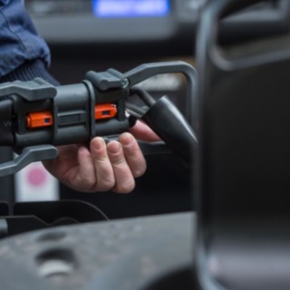 Mitarbeiter der Gusto AG lädt Kommissionierer mit Lithium-Ionen-Batterie